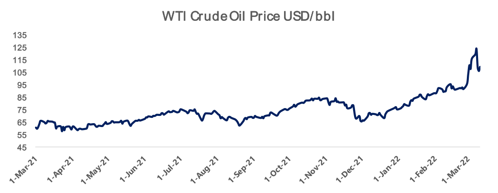 The WTI Crude oil price has surged 80% y/y to USD109.33/bbl in light of fears of catastrophic supply concerns.