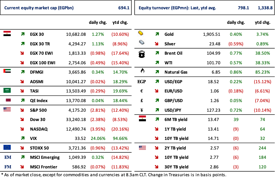 Etisalat Misr reported revenues of AED1.3bn (c. EGP6.6bn) in Q1 2022, up 15% from the same quarter last year. Top line growth was mainly driven by an increase in subscribers and mobile data and voice revenues. The company’s subscriber base in Egypt grew 6% y/y to reach 28.1mn subscriber. (Enterprise)